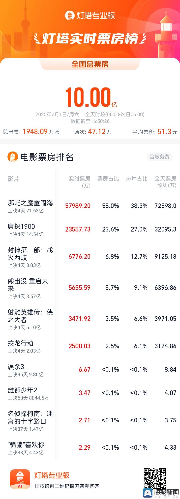 截至2月1日16时50分,2025大年初四单日票房破10亿