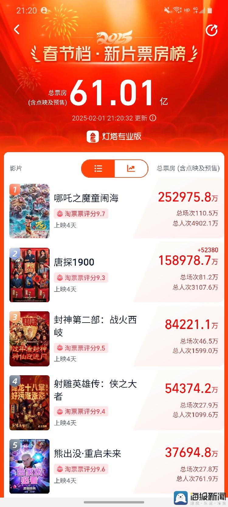 大年初四单日票房破10亿 春节档总票房突破61亿