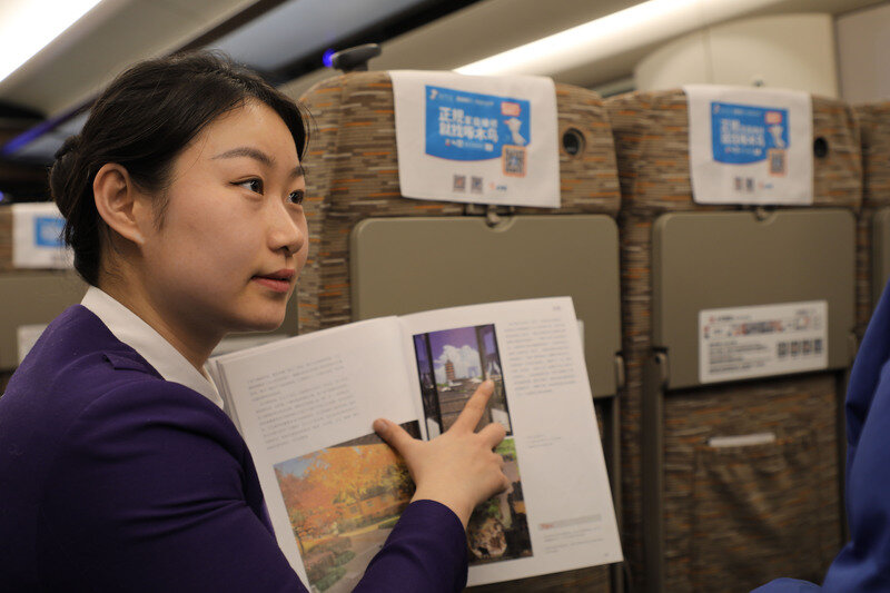 在G5547次列车上,乘务员殷绎茹正在为旅客介绍当地风景特色,满足旅客多样化需求前不久一次值乘中,郑州东站上来了祖孙俩,一名瘦弱小男孩牵着奶奶,老人背着将近一人高的行李。看着老人身上摇摇欲坠的行李,殷绎茹赶忙搀扶老人引导到座位上,并在手持终端上标记出了他们两个人的座号。巡视车厢过程中,她多次提醒老人各种注意事项,并耐心解答老人的问题。