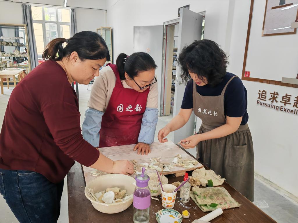 在牡丹区新经济产业园,刘翠英(右一)正指导手工匠人设计牡丹瓷文创产品。新华社记者刘铮 摄