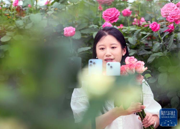 在莒县招贤镇曲坊现代农业产业园的玫瑰基地,工作人员通过网络直播销售鲜切玫瑰花。新华社发(兰红光 摄)