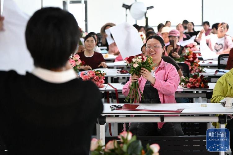 在莒县招贤镇小罗庄村的田间课堂内,村民在插花艺术特色技能培训班上学习插花技艺。新华社发(兰红光 摄)