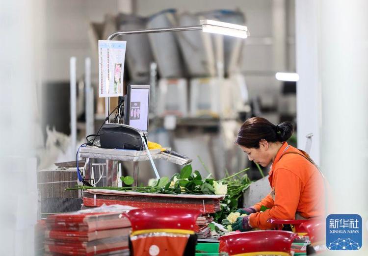 在莒县招贤镇曲坊现代农业产业园的鲜切花包装车间,工人在包装鲜切玫瑰花。新华社发(兰红光 摄)
