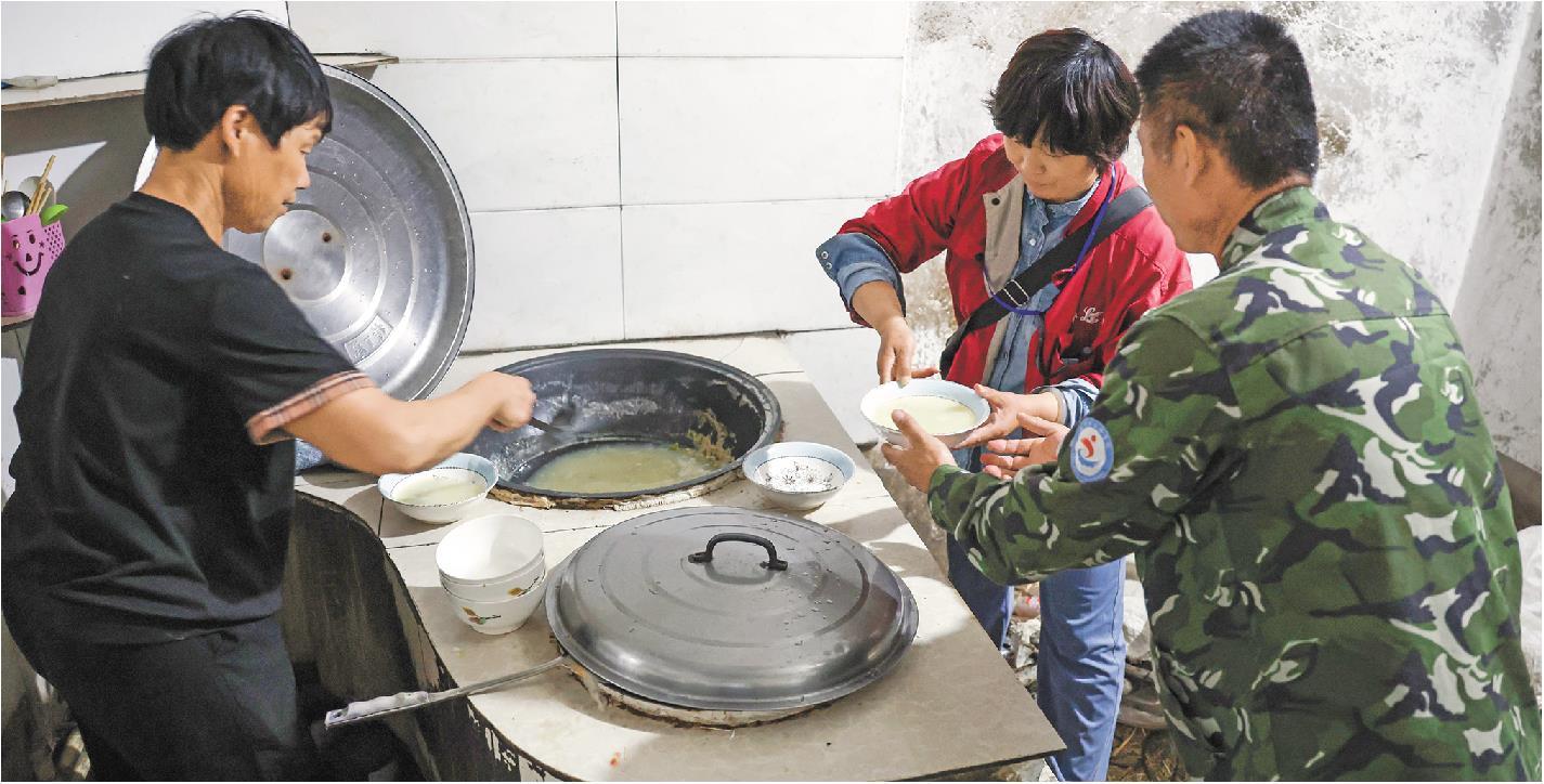 5月27日晚,在河南驻马店平舆县杨埠镇,老乡为麦客张岭、王喜红两口子准备了晚饭。