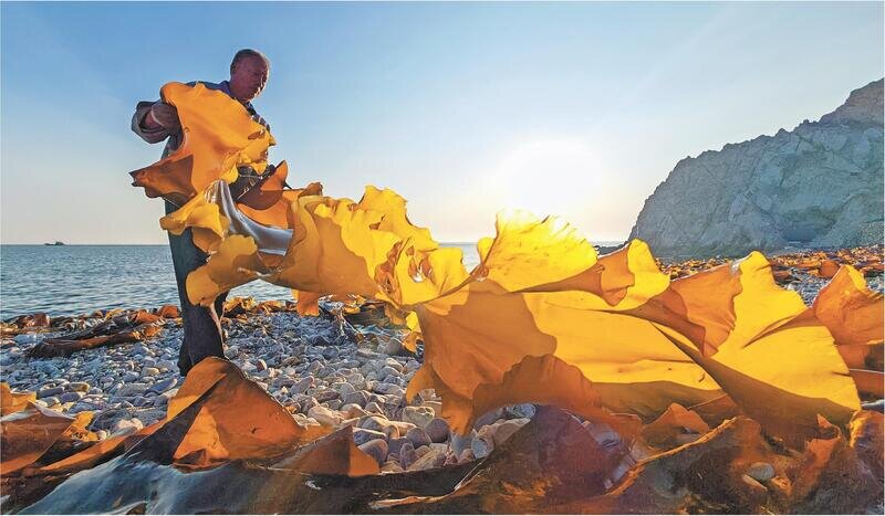 与此同时,在渤海海峡中段的烟台市长岛综合试验区大钦岛乡,迎来了海带收获旺季。这里是山东省距离陆地最远的乡镇,独特的地理位置和自然条件,使其成为我国重要的海带养殖生产基地,海带出口量占全国70%以上。凌晨三点,岛上养殖场灯火亮起,准备下海的工人们熟练地穿上油裤、救生衣和长筒水靴,开启了一天的忙碌。他们熟练地钩、捞、割、提、捆、码,将收割的海带运往晒场晾晒。为了赶在水温升高前完成收割,大钦岛人携手近两千名外来务工人员,与“日头”较劲,上演着“抢收大会战”。