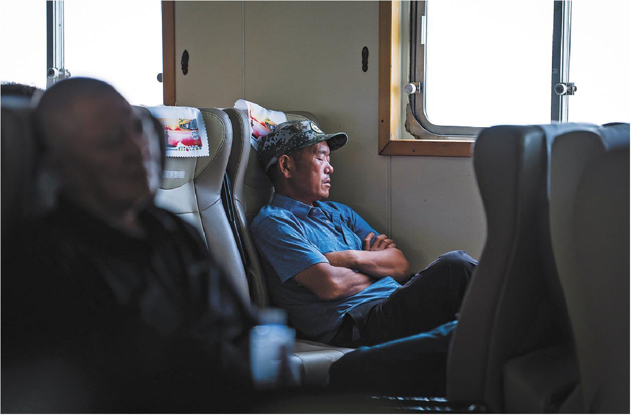 在由蓬莱开往北五岛的轮渡上,一名旅人正在小憩。正值海带丰收季,许多外地人选择上岛务工。