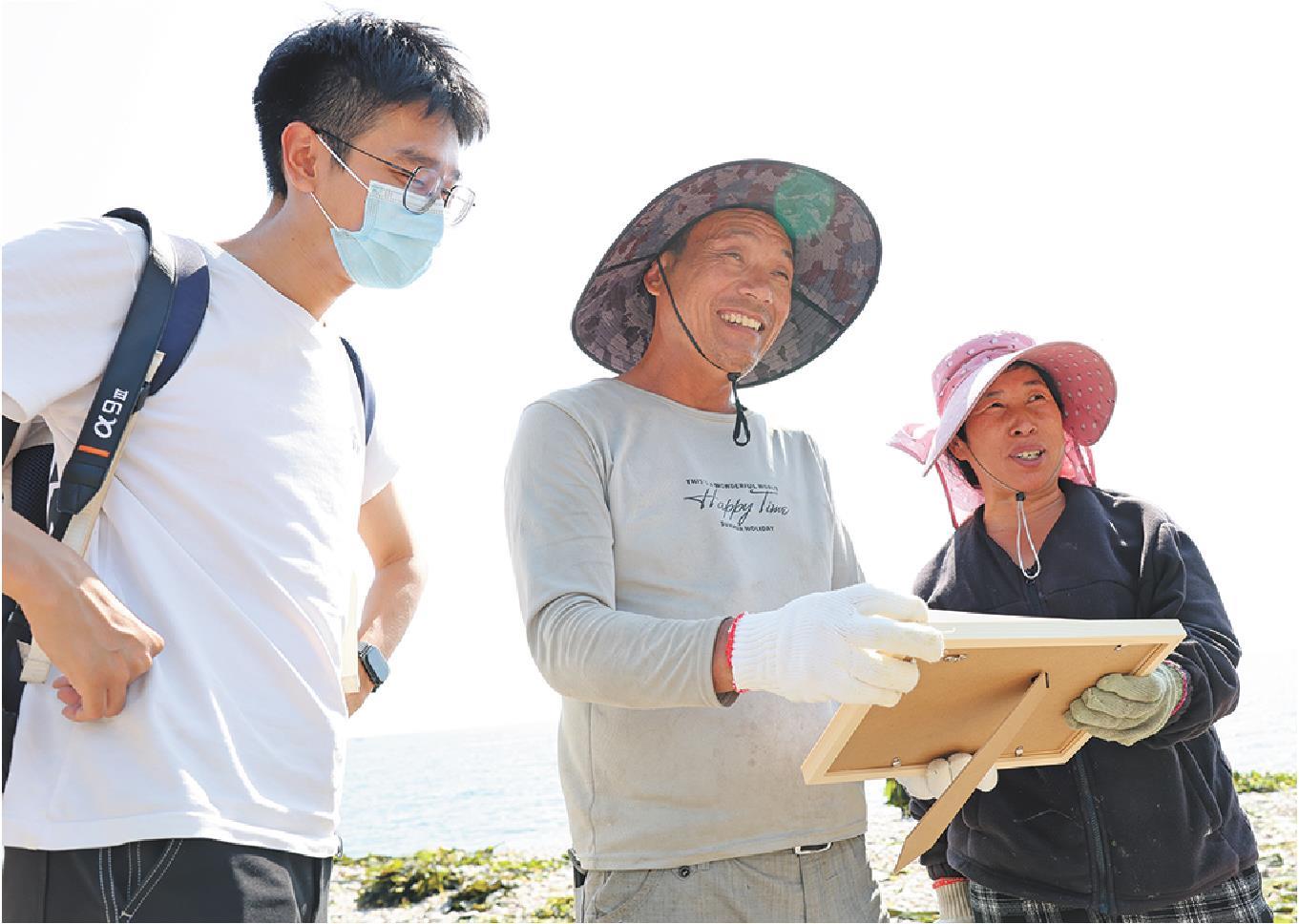 本报记者将打印好的照片送到晾晒海带的工人手中。