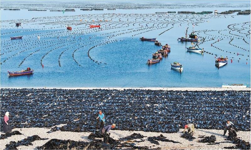 大钦岛南村的工人在海滩上晾晒刚收割上来的海带。