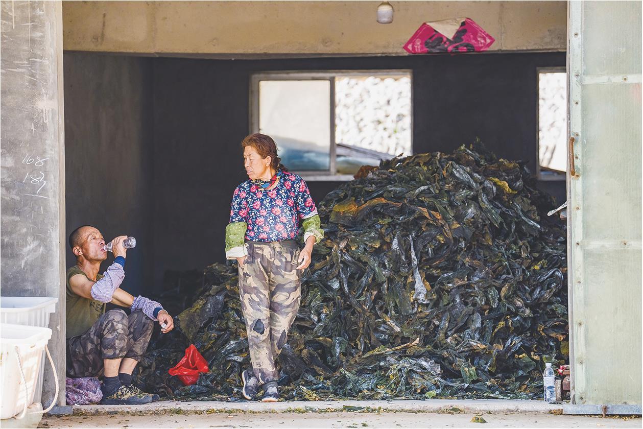 在大钦岛西口附近的海带晾晒场,来自东北的夫妻俩正在堆积如山的海带前歇息。他们来这务工有两个月,日薪能比在老家打工时多几十块钱。