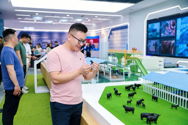 “现在牧场里存栏量是5000多头牛,只配备了5个人,一个人负责配料、两个人负责开车撒料、一个兽医再加上一个后勤总管,5个人就能把这5000多头牛养好。”牧场工作人员介绍道,“我们通过数字平台和电子耳标对牛进行实时监控,把控牛棚温度、湿度的同时,也能检测牛的健康情况。在这里产出的牛肉经过精细化分割后都会形成溯源码,扫码就能查看‘牛的一生’,让消费者吃得放心。喂养方面,饲料运送来后直接被传输进仓,有专门的工作人员按照肉牛在不同阶段的需求进行配比,而后通过撒料车投放饲料,整个流程十分精准、高效。”