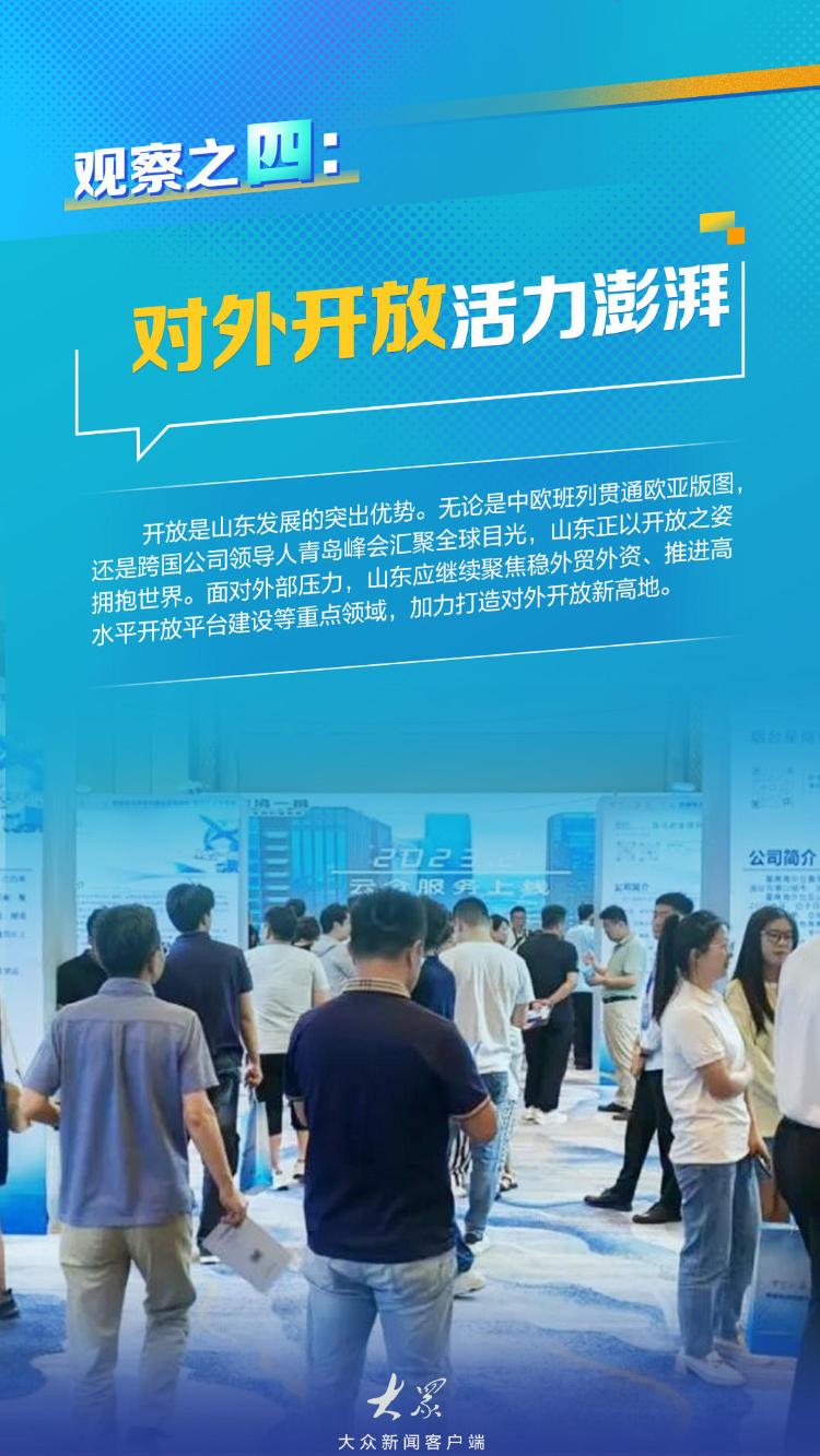 开放是山东发展的突出优势。无论是中欧班列贯通欧亚版图,还是跨国公司领导人青岛峰会汇聚全球目光,山东正以开放之姿拥抱世界。面对外部压力,山东应继续聚焦稳外贸外资、推进高水平开放平台建设等重点领域,加力打造高水平对外开放新高地。