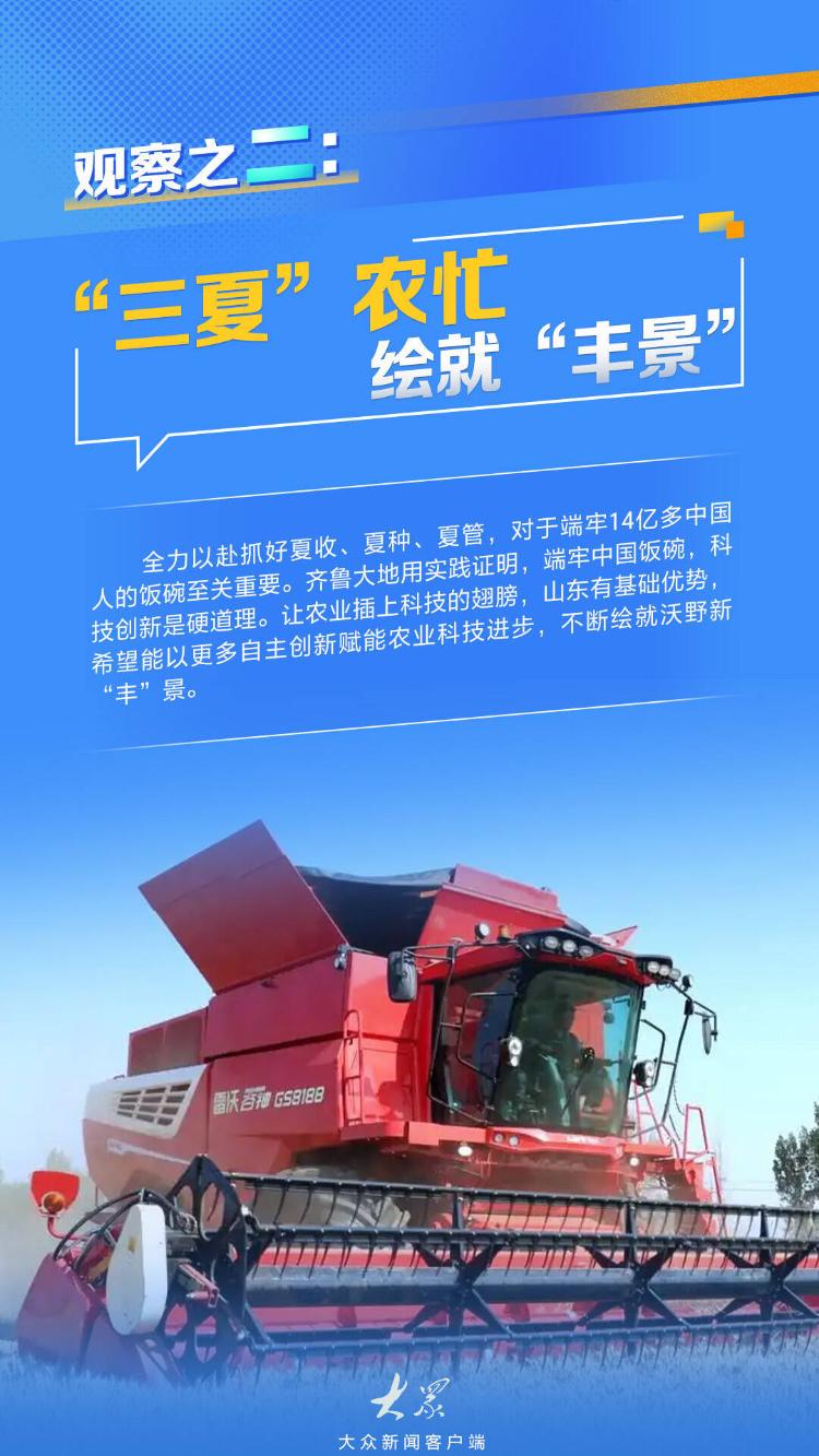 全力以赴抓好夏收、夏种、夏管,对于端牢14亿多中国人的饭碗至关重要。齐鲁大地用实践证明,端牢中国饭碗,科技创新是硬道理。让农业插上科技的翅膀,山东有基础优势,希望能以更多自主创新赋能农业科技进步,不断绘就沃野新“丰”景。