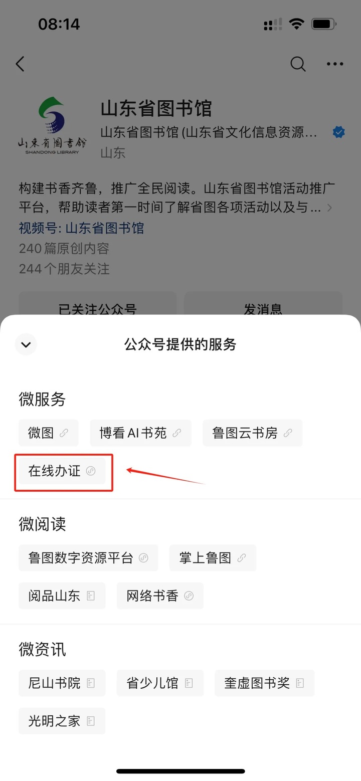 关注“山东省图书馆”微信公众号,→点击菜单栏“微服务”