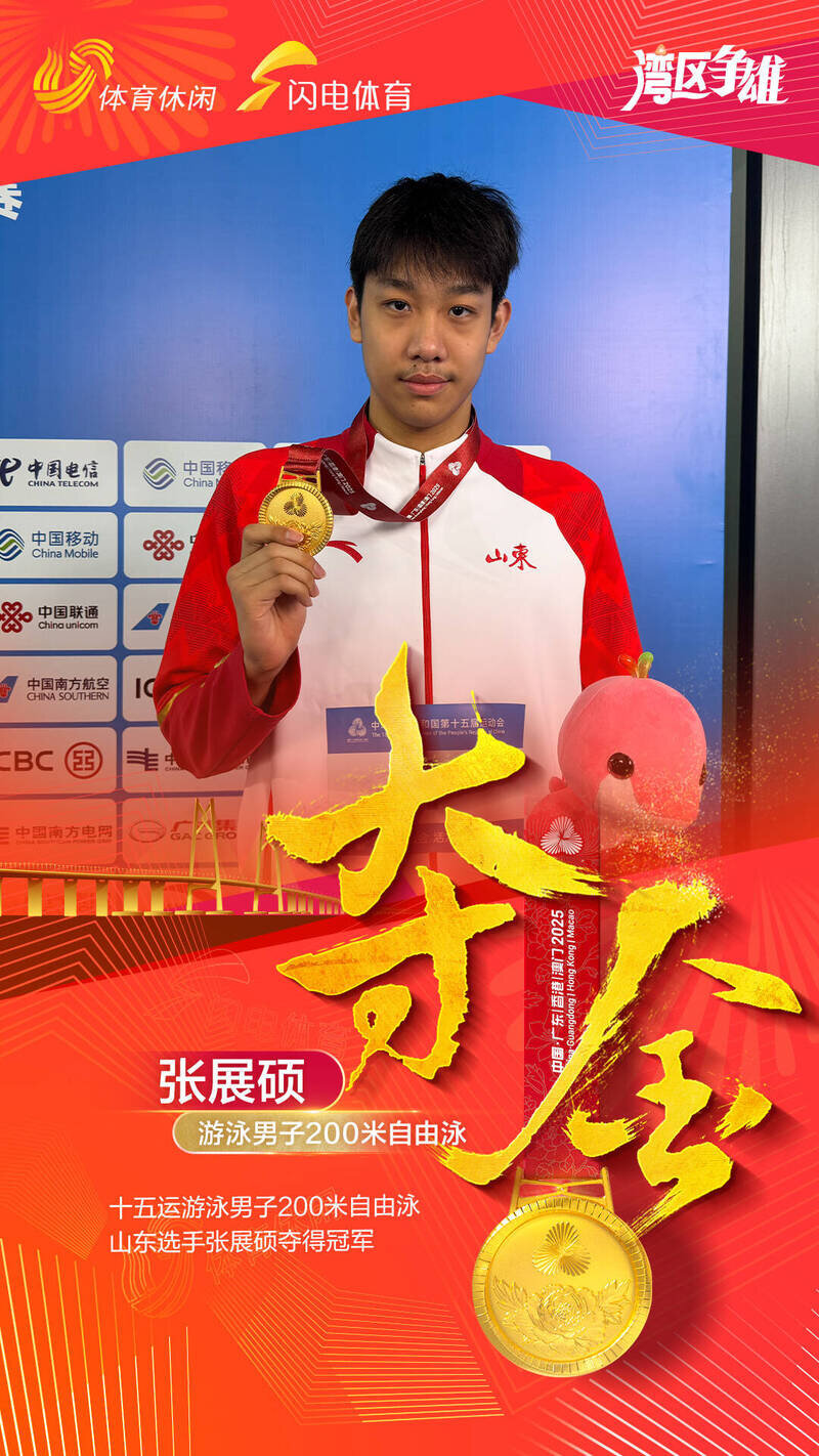 在游泳的男子200米自由泳决赛中,张展硕以1分44秒86的成绩获得了自己第二块十五运金牌,将自己1分45秒84的个人最好成绩提高了将近一秒。