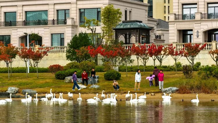 2025年10月31日,山东省荣成市樱花湖公园,市民在岸边观赏并迎接远道而来的美丽的大天鹅。