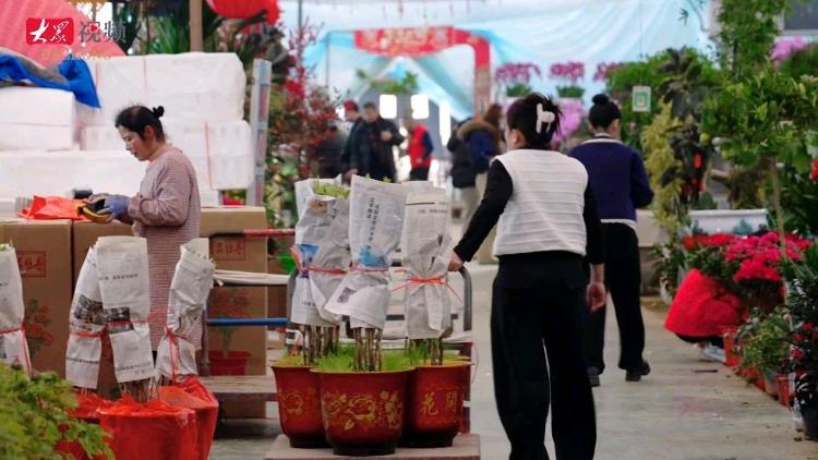 在商户苏婷的摊位前,来自江苏、河南等地的采购商络绎不绝,一旁的工人正有序分拣、打包。今年她备下了二十多个牡丹品种,临近春节,日均销量从往常的200余盆增至近400盆,直接翻了一倍。大棚外,来自云南的货运司机袁志兴正搭手搬运,这辆能装900盆牡丹的专车,即将启程南下,千里“赴约”。