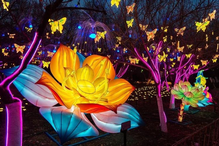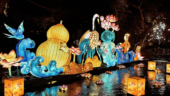 五龙潭公园的“花涧秘境”氛围拉满,一组组梦幻与浪漫交织的灯组璀璨夺目,搭配河灯祈福特色活动,为游客带来新春的欢乐与奇趣。