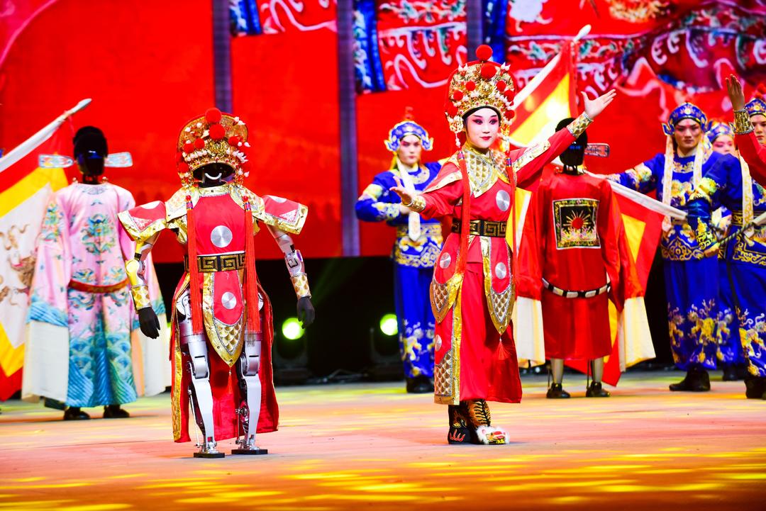 2月14日晚,2026山东省机器人春节晚会在济宁举办。戏曲联唱《人机戏曲串烧》节目中,机器人着戏服表演。 ( 记者 吕光社 报道)