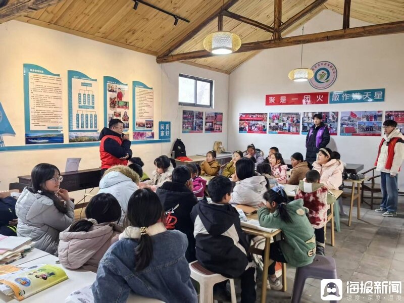 叮嘱完为活动搭建场地的工作人员,王浩来到了村里的假期小课堂。寒假期间,藤花峪村办起了免费托管班,邀请村里的志愿者和回村的大学生,辅导村里以及邻村的孩子功课。而在去年暑假,共有超过120个孩子在这里学习、游戏,还有免费午饭。除了开设文化课,王浩还带着孩子们去周边非遗古村落研学,邀请非遗代表性传承人表演京剧和皮影戏,带孩子们了解优秀传统文化,开拓视野。