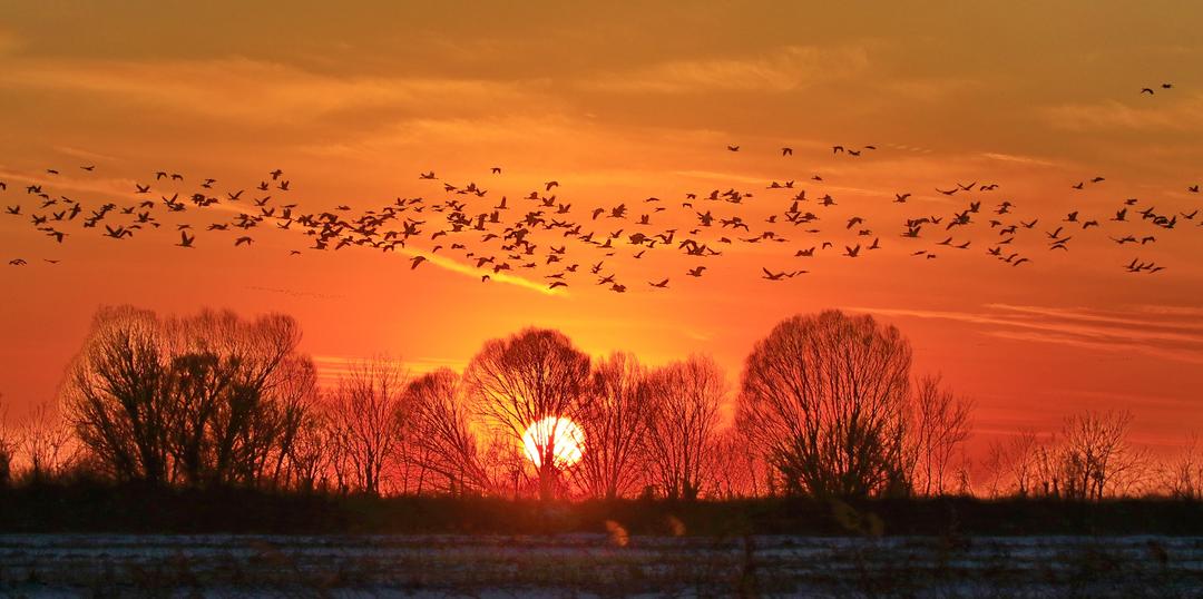 (冬日傍晚成群的鸟类形成一幅诗意画面。赵文昌摄)