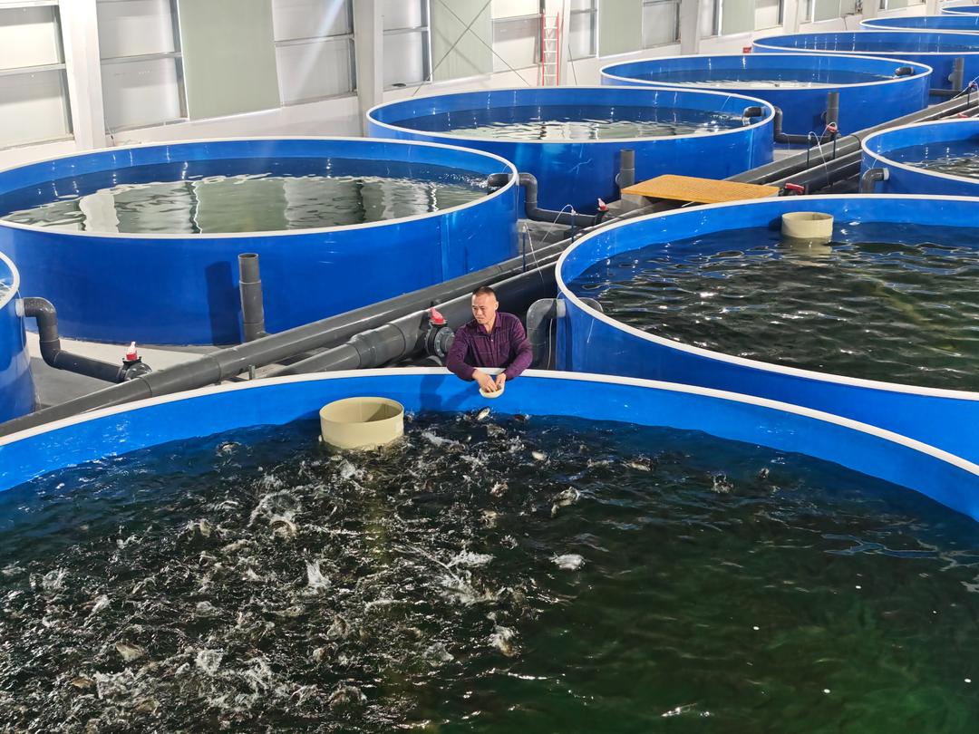 郓城县郓鲁渔业有限公司的养殖车间,40个养殖桶整齐排列。工作人员撒一把鱼食,一群群鲈鱼浮上水面争食。