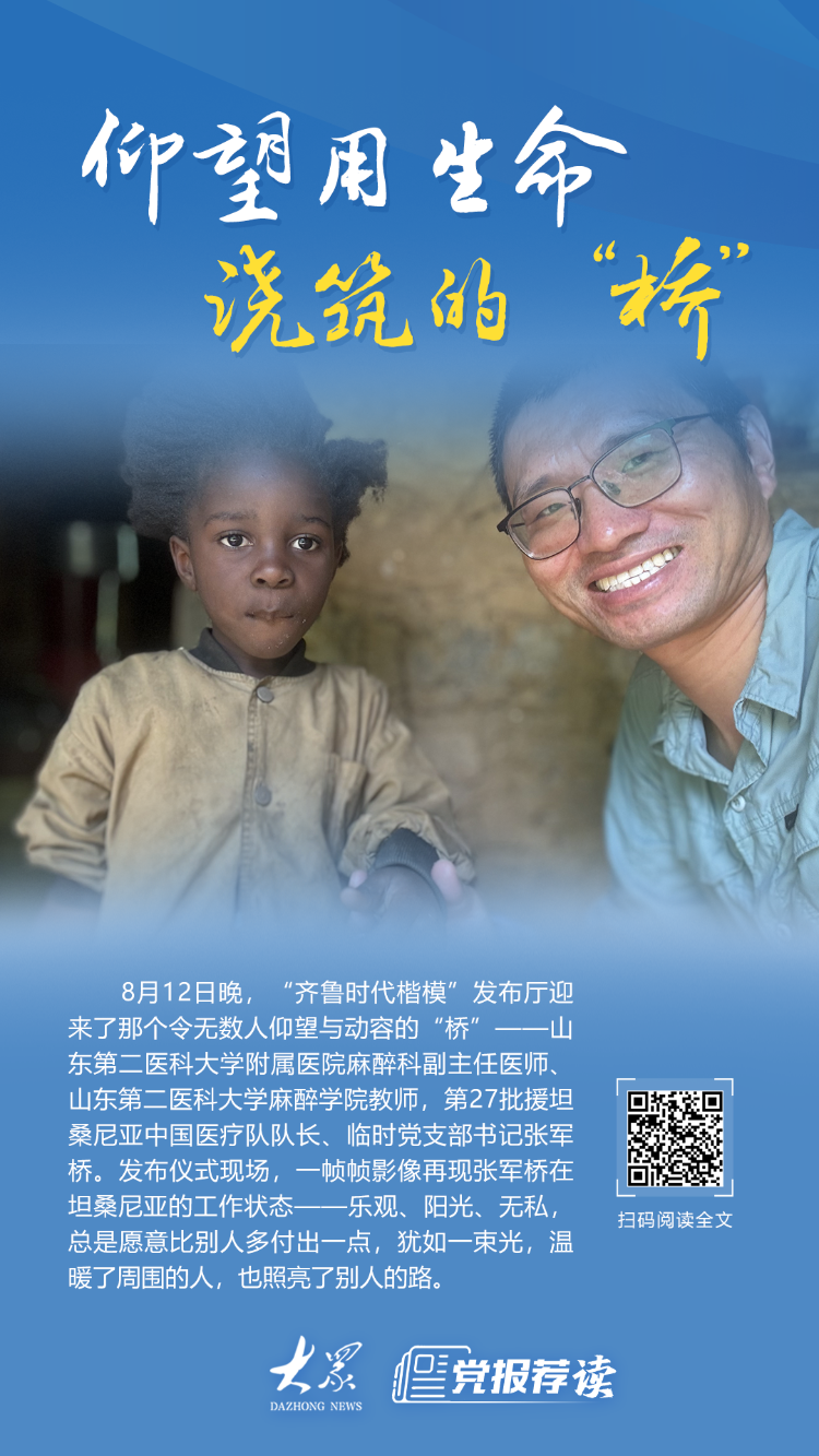 8月12日,“齐鲁时代楷模”发布仪式举行,山东援非医生张军桥同志被追授“齐鲁时代楷模”称号。