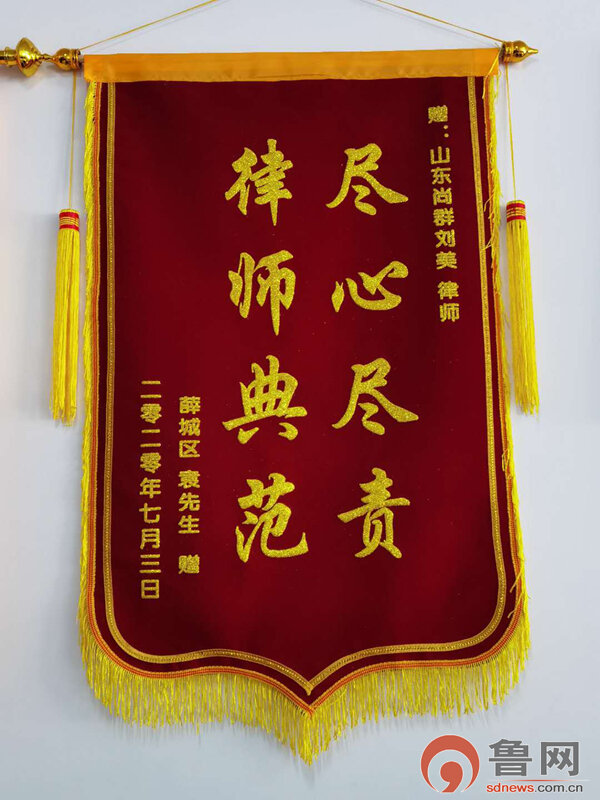 袁某接到判决书后,喜出望外,惊喜不知该如何表达,所以在2020年7月5日的时候,给刘美律师送来了一面写有“尽心尽责、律师典范”的锦旗。刘律师表示,作为一名律师能够得到当事人的肯定,对她来讲是莫大的精神鼓励。