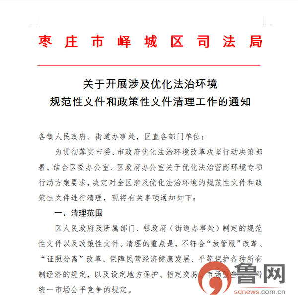 鲁网9月3日讯 (记者 张程 通讯员 陈思蒙)为贯彻落实枣庄市委、市政府优化法治环境改革攻坚行动决策部署,结合峄城区委办公室、区政府办公室关于优化法治营商环境专项行动方案要求,峄城区司法局于7月28日下发了《关于开展涉及优化法治环境规范性文件和政策性文件清理工作的通知》,对全区43个行政规范性文件制定主体开展涉及优化法治环境规范性文件和政策性文件清理工作。通知要求各单位负责清理本单位出台的规范性文件和政策性文件,以及本单位起草的以峄城区政府或区政府办公室名义出台的规范性文件和政策性文件。