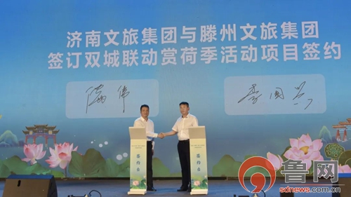 紧接着,在全场瞩目下,济南文旅集团旅游开发公司与滕州文旅发展集团郑重签订了双城联动赏荷季活动协议。这一具有里程碑意义的时刻,标志着两地文旅合作迈入崭新阶段,如同开启了全新文旅篇章的金钥匙,为未来的合作奠定了坚实基础。