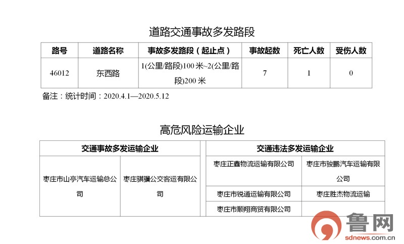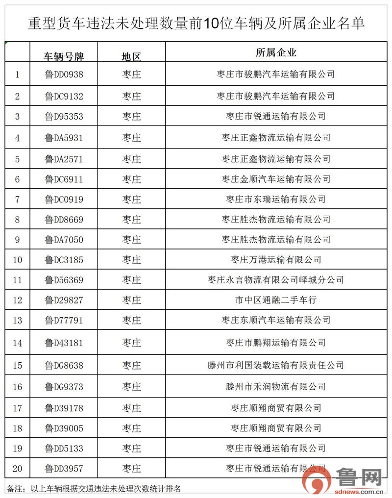 交通违法多发运输企业为:枣庄正鑫物流运输有限公司、枣庄市骏鹏汽车运输有限公司、枣庄市锐通运输有限公司、枣庄胜杰物流运输、枣庄市顺翔商贸有限公司 。