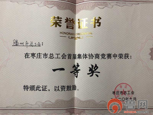 鲁网9月16日讯(记者 陈庆武 通讯员 刘清利 李颖)9月11日,枣庄市首届集体协商竞赛在市总工会开赛。竞赛由枣庄市总工会承办,山东管理学院、市人社局、企业家协会应邀参加,全市共有7支代表团、28名选手参与竞赛。山东赞国律师事务所律师翟继栋、王倩、韩亚迪、侯建宇代表滕州市总工会参赛并荣获一等奖,将代表枣庄市赴济南参加山东省集体协商竞赛。其中,王倩、韩亚迪律师荣获竞赛最佳选手奖,翟继栋、侯建宇律师荣获优秀选手奖。