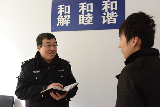 王长江是一位十分喜欢学习的同志,是个地地道道的“书虫”。平日里,只要有空余时间,他总是书不离手,广泛涉猎各方面的书籍,丰富的知识成为他游刃有余处理棘手问题的法宝,成为他调解纠纷的金钥匙,成为他聚拢人缘的基石。不论是同在一起摸爬滚打的战友,还是社区群众,无论60后,还是90后,大家都喜欢跟他聊天,总找到与他共同的话题。王长江同志不仅注重从书本学,还注意从群众中汲取知识,他利用深入社区的机会,与老党员、老退休职工、社区干部广泛探讨交流,通过拉家常式的谈话,不仅丰富了自己的知识,学会了与群众打交道的方式方法,也拉近了与群众的心理距离。2014年5月份,辖区群众庄某在下园街王某大院门口处私自建设一违章建筑,而且庄某与院主人王某一直存在个人矛盾,王某便强行拆庄某私建房,最终引发报警。针对该类警情,按照其性质,不属公安机关立案查处范围,王长江作为处警民警履行完当场调处职责,告知双方不属公安机关管辖或移交相关部门处理便可。但考虑当事人双方系邻居,双方因此事矛盾日趋尖锐,如若不及时干预,加以调解说服,将其推出去,最终可能引发更大矛盾隐患。因此,王长江便受理了这起不是案子的“案子”,帮助双方走出矛盾阴霾。王长江通过认真分析引发双方矛盾的根本原因,并梳理了关于违章建筑、城市管理等法律规定,以法明理,以情说教,多次登门,与当事双方分别交流,使庄某认识到私自建设违章房屋将要承担的法律责任和相关后果,同时使王某认识到其不代表政府,其行为不受法律保护。最终使僵持的双方不再固守己见,双方达成调解协议,化干戈为玉帛。12月7日,古商城内有一商户尚某因拒绝缴纳水费被自来水公司停水,致使其周边十余家住户也缺水两天,引起住户极大不满,他们找到王长江想办法。了解到该情况后,王长江立即向自来水公司了解情况,掌握事件发生的原因,共同商议解决方案,同时,积极走访安抚涉事群众,与引发事件的当事人尚某谈话做说服教育工作,当日下午尚某认识到了错误,同意按照标准缴纳所欠水费,小区终于恢复正常用水,涉事群众对他感激不已。对待群众如此,对待案件违法嫌疑人,他也是坚持平和理性的执法理念。