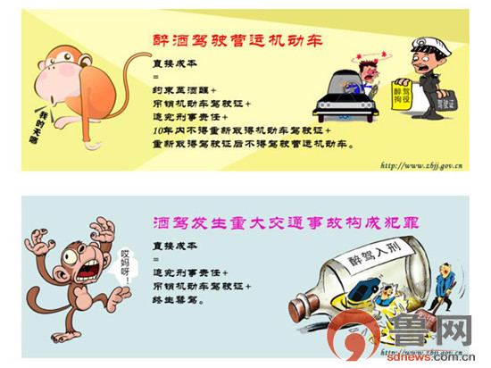 鲁网淄博3月23日讯(记者 齐征 通讯员 曹利 刘少华 薛峰)春分过后,天气转暖,白昼时间逐渐变长,人们外出活动增多,酒后驾驶交通违法行为多发。为了向群众进一步宣传酒后驾驶的危害性,近日,淄博交警在淄博公安交警网、“@淄博交警”新浪微博推出了《猴哥话安全之酒驾篇》,结合2016年是农历丙申年,采用“猴哥”这一特定称谓,用诙谐幽默的卡通形象,配以注释相关法律法规,直观展示酒后驾驶的成本和危害性,提醒人们切勿酒后驾驶!