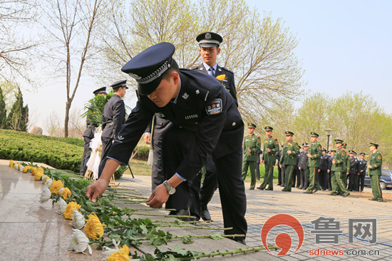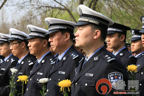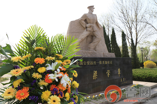 4月1日上午,近百名公安干警手持鲜花在纪念碑前整齐列队,脱帽默哀,场面庄严肃静。随后,在淄博人民警察训练基地政治处主任董杰超带领下,全体干警重温了入警誓词,并依次向梁学章雕塑献花。