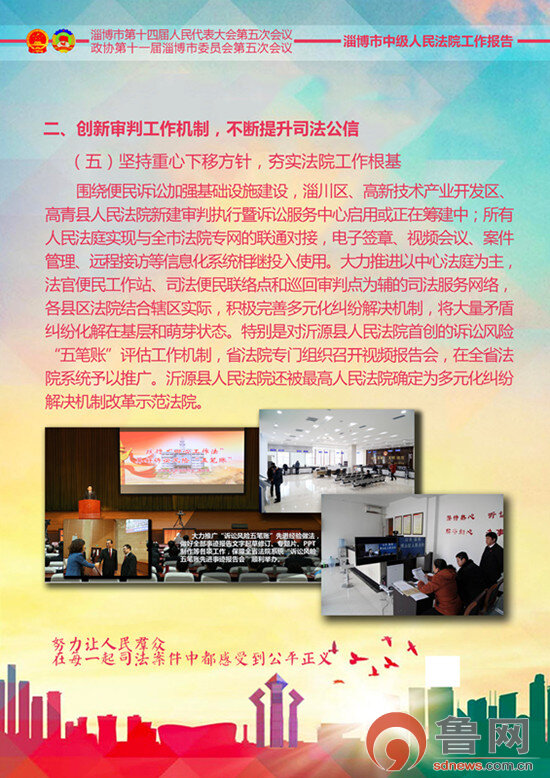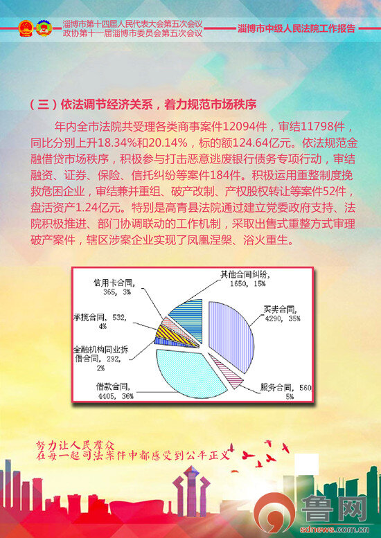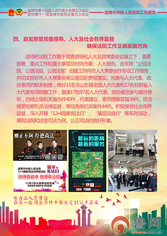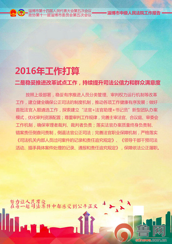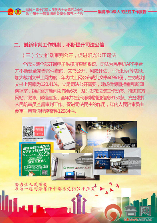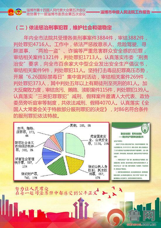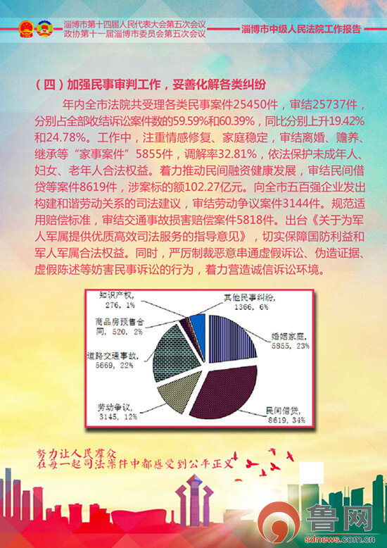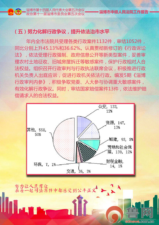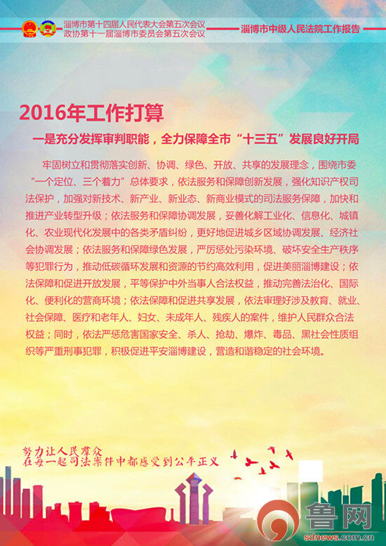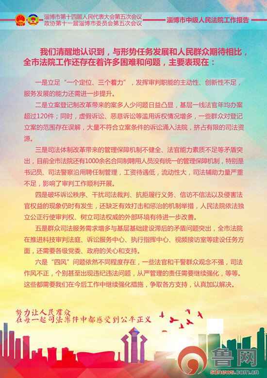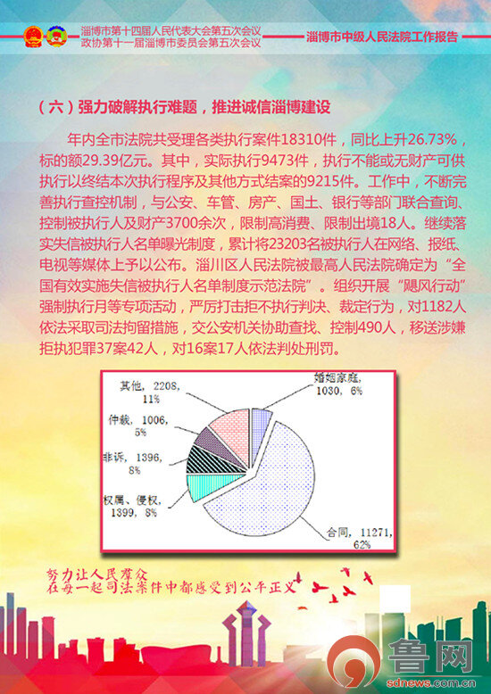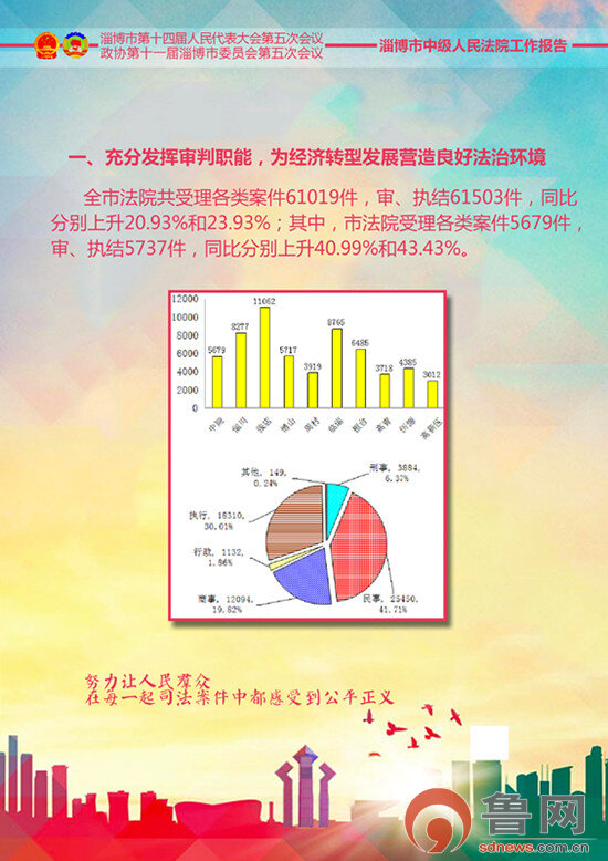 鲁网淄博1月19日讯(记者 崔新孝 马照敏 通讯员 张玉杰 朱峰)1月19日上午,淄博市十四届人大五次会议举行第二次全体会议,淄博市中级人民法院代院长王玮作了淄博市中级人民法院工作报告。2015年,全市法院共受理各类案件61019件,审、执结61503件。