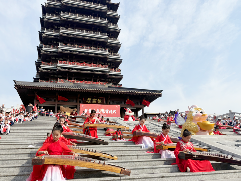活动伊始,百人古筝齐奏《我和我的祖国》奏响庆典序曲,随后,舞蹈《月满中秋》以优美舞姿诠释传统韵味,经典诵读《少年中国说》用童声传递青春力量,最后全场合唱《歌唱祖国》,将家国情怀与书香气息推向高潮。