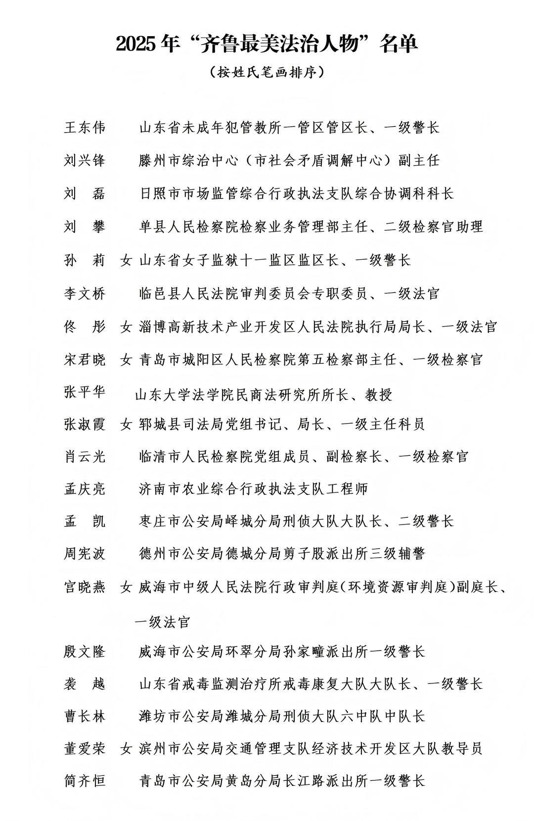 鲁网2月12日讯 近日,2025年“齐鲁最美法治人物”发布仪式在济南举行。 “齐鲁最美法治人物”的“美”是硬核担当,更是司法温情; [详细]