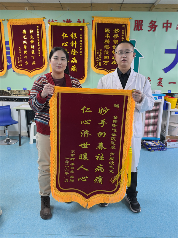鲁网1月26日讯 1月24日上午,市民李女士将一面写有“妙手回春祛病痛,仁心济世暖人心”的锦旗送到阳信县金阳街道社区卫生服务中心中医科尹鹏波大夫手中。