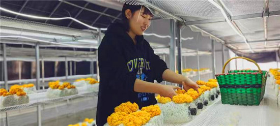 近日,王元华大棚里的第一茬金耳喜获丰收,工人们正忙着采摘长势喜人的金耳,脸上洋溢着丰收的喜悦。置身大棚,菌香扑鼻,一排排菌棒上长满了金灿灿的“黄金花”,宛如遨游在金色的花海,朵朵金花纹理如沟壑,肉嘟嘟的煞是喜人。