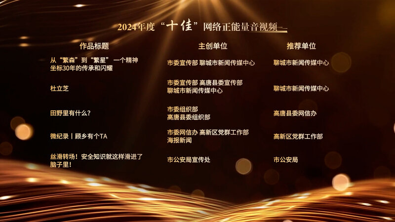 2024年,市委网信办组织开展2024聊城“五个十佳”网络正能量精品评选活动,积极对标对表中国正能量网络精品评选、山东“双百”正能量网络精品评选,在全市范围内征集遴选展播一批网民认可、社会认同、影响广泛的网络正能量作品。活动历时两月余,共收到参选作品800余件。经过紧张的初审、复审、专家评选及网上公示,116件作品凭借其独特的视角、真挚的情感和深刻的内涵脱颖而出。其中,《从“繁森”到“繁星”一个精神坐标30年的传承和闪耀》《田野里有什么?》《丝滑转场!安全知识就这样滑进了脑子里!》等6件作品获评2024山东“双百”网络正能量精品,在省级平台展现了全市人民对城市的热爱与奉献,传递出来自聊城的温暖网络力量。