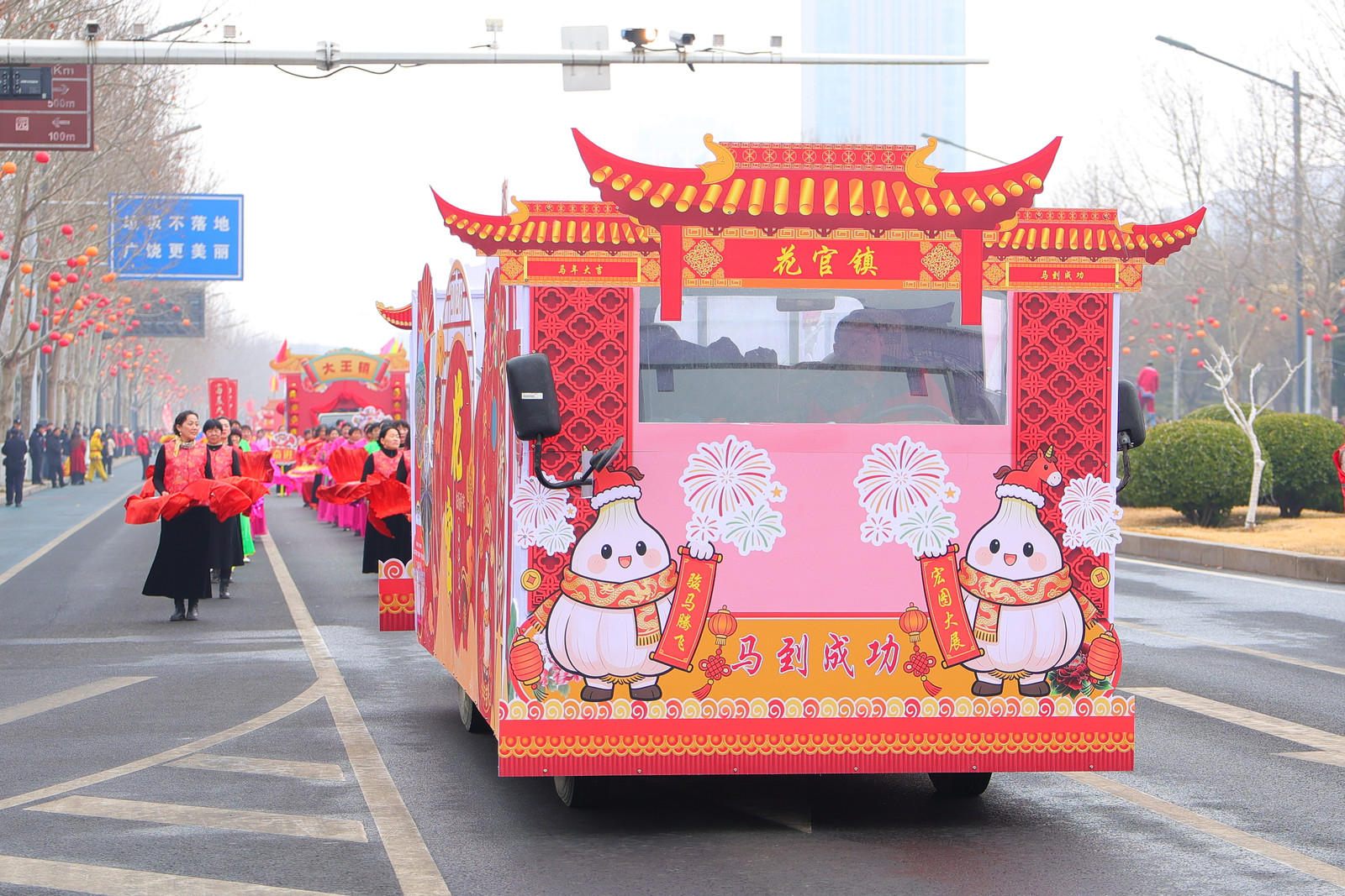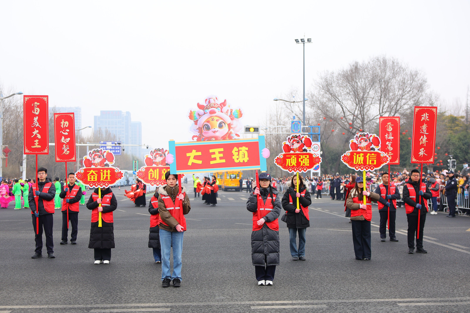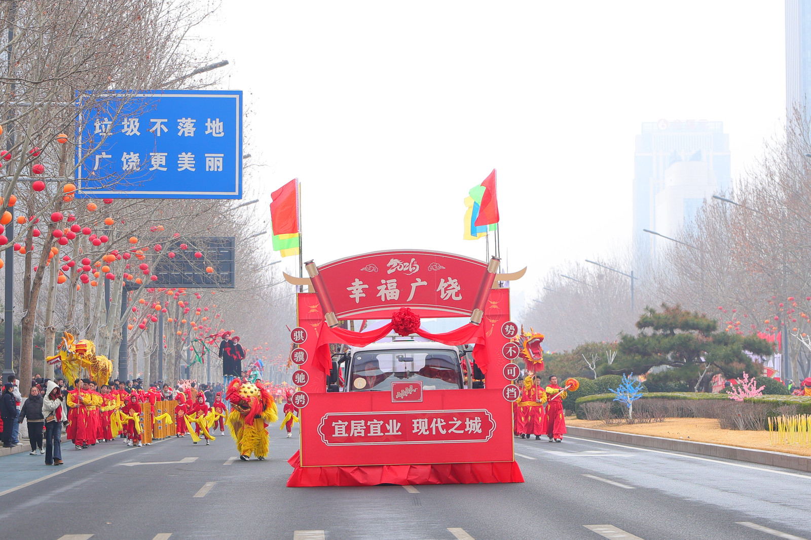 本次活动由广饶县人民政府主办,中共广饶县委宣传部、广饶县文化和旅游局承办。活动以“春满乐安”为主题,以“巡游+展演”相结合的形式开展,1100余名参演人员组成特色巡游队伍,沿着乐安大街行进展演,为广大市民朋友献上一场兼具文化底蕴与时代气息的民俗非遗盛宴。活动现场锣鼓铿锵、气氛热烈。兵圣战鼓气势雄浑、响彻街头;各镇街特色彩车依次亮相,紧扣地方文化特色,深度融入非遗元素,生动展现广饶千年古县的深厚历史文脉与全国百强县的蓬勃发展活力。舞龙舞狮气势恢宏,秧歌、旱船等传统民俗节目轮番上演、精彩纷呈,参演人员精神饱满、盛装亮相,一路传递新春祝福,吸引众多市民驻足观看、拍手称赞。