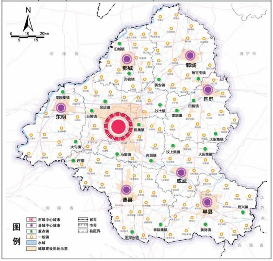 “多极”指城镇化发展增长极。积极培育曹县、郓城、单县、巨野、鄄城、成武等中小城市,作为市域重要增长极和新经济增长点, 突破市域城镇空间 “弱中心、均质化”状态 。