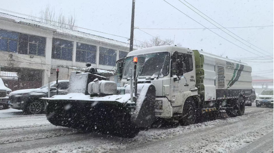 在机械作业方面,洒水车、雪滚车、撒布机等机械设备纷纷出动,对主次干道车行道进行清雪除冰,有效防止道路积雪结冰,保障车辆通行安全。人工清扫也同步推进,全区环卫工人积极行动,对背街小巷、人行道、公交站点、公厕周边等重点区域展开清扫。他们手持雪铲、扫帚,加大对责任路段的清扫力度,力求快速清除道路积雪,方便市民出行。