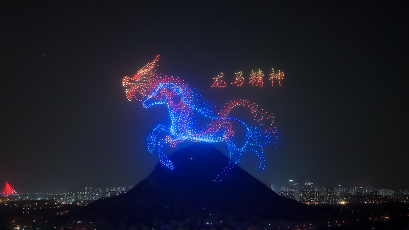 最让现场观众连连称绝的,当属“龙马精神”的震撼演绎。无人机编队勾勒出龙马昂首腾跃的磅礴场景,鳞爪飞扬、光影交错间,恰是对历城人民奋勇争先、昂扬向上精神风貌的生动诠释;表演最后,“历城人民欢迎你”的暖心字样缓缓浮现,温暖的光影点亮整片夜空,现场欢呼声、掌声此起彼伏,将氛围推向最高潮。