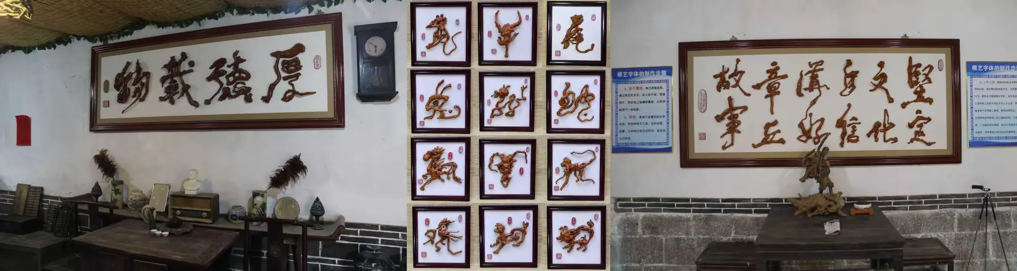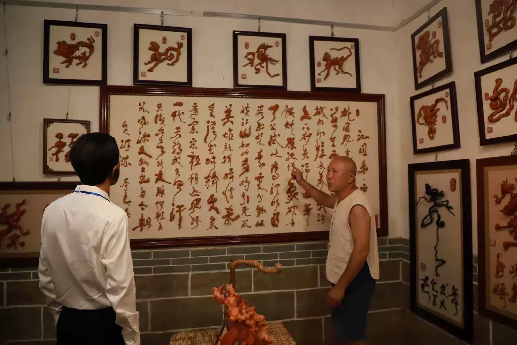 走进东矾硫村,青石墙体、灰瓦屋顶的明清建筑错落有致,青石圩子墙和带阁楼的四方大门诉说着往昔繁华。这个国家级传统村落里,土生土长的非遗传承人李良,以山间枯根为材,顺自然之形、融书法之韵,独创“根艺书法”,让废弃枯木化身立体的笔墨。“三分人工,七分天成”,他不强行雕琢、不刻意扭曲,于盘根错节间捕捉天然神韵,经选材、修剪、打磨、拼接等数十道工序,耗时数月方成一幅作品。一件件根艺作品,或为遒劲书法、或为灵动摆件,藏着东矾硫村“耕读传家”的百年文脉,映照着官庄匠人尊重自然、坚守传承、守正创新的精神风骨。