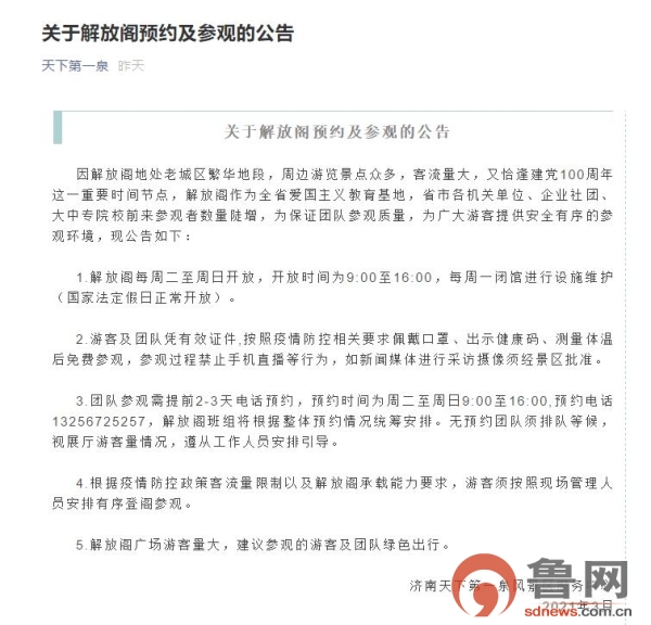 济南解放阁发布公告:团队参观需提前电话预约 禁止手机直播