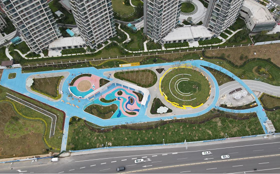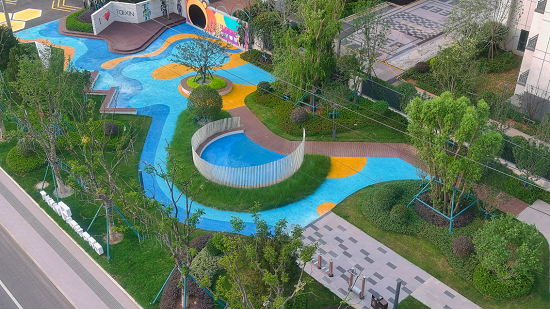 柳青·流苏园位于黄白河路与南京路交会东南,占地6570平方米,以乐符为元素,以音乐互动参与、儿童活动、健身、休闲为主要功能,通过手鼓、手敲琴、传声筒等互动体验,体现音乐的参与性,结合律动广场,增加场地的律动活力,成为功能性独特的音乐主题公园。