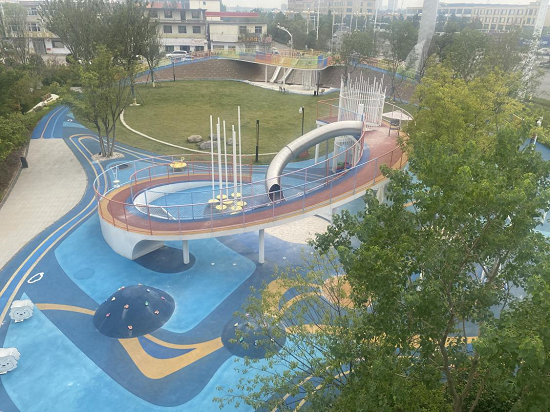 云溪公园位于沂州路与湖北路交汇处,占地约6700平方米。设计方案以“缘要山水·云中飞虹”为主题,拥抱山水情怀和舒适空间,在山水中导找飞虹般灿烂的生活与童趣。公园由5大部分组成:彩虹阶梯、虹光之门、飞虹溪谷、虹之秘境、鸿蒙花园,外侧通过层级绿化围合公园转角,内侧通过趣味喷泉、彩虹爬道、阳光草坪、零岩、滑梯、秋千、沙池等设施,满足各年龄段活动需求。
