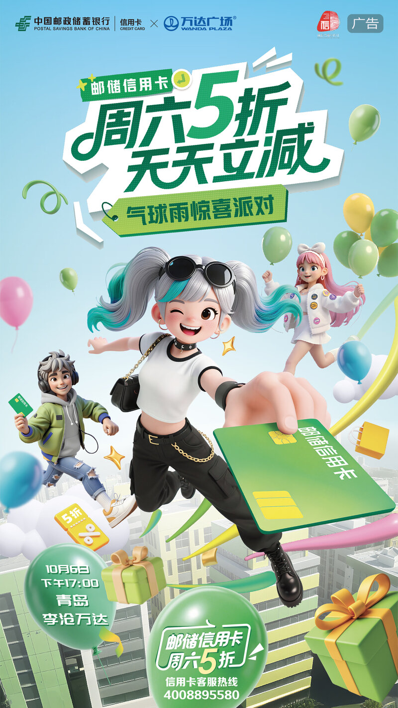 鲁网9月30日讯 2025年国庆、中秋双节同庆之际,为回馈广大市民与持卡人长期以来的支持,邮储银行青岛分行将于10月1日-8日,在青岛李沧万达广场中庭推出“邮储信用卡 周六5折 天天立减——气球雨惊喜派对”大型主题线下互动活动。届时,一场融合趣味游戏、惊喜好礼与金融福利的假日盛宴即将开启,为岛城百姓的黄金周长假增添一份别样精彩。