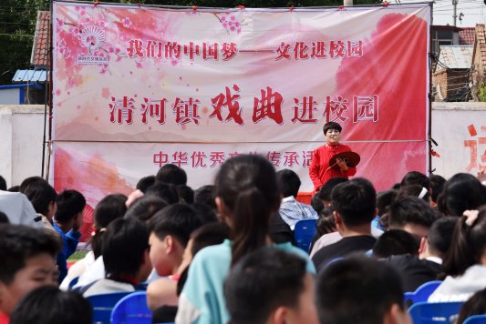 据清河镇文化站站长石玉琳介绍,举办“弘扬戏曲文化 美德走进校园”活动,旨在让学生近距离接触和了解戏曲文化,弘扬中华传统美德,推动优秀传统文化在学校的普及和传播,以美传真、以戏育人、立德树人。